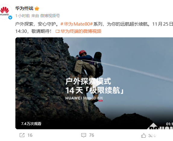 2025年11月20日,华为终端官宣,华为Mate 80系列手机支持“户外探索模式”,可实现14天“极限续航”。