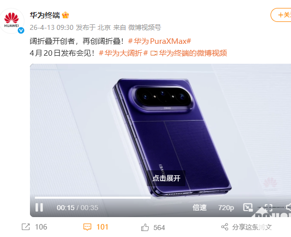PChome 4月13日消息,今日,华为正式公布了Pura X Max手机,这是行业首款横向阔折叠手机,官方宣传语为“阔折叠开创者,再创阔折叠”。