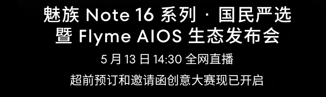 星纪魅族科技官方于今日上午发文称:魅族Note 16系列・国民严选暨FlymeAIOS生态发布会定档5月13日14:30全网直播。