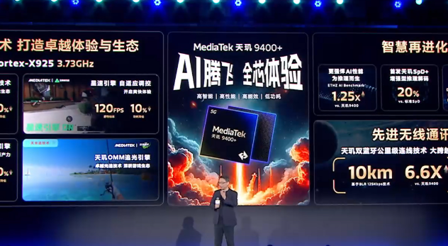 联发科举办天玑开发者大会2025,正式发布一款定位旗舰5G智能体AI芯片,综合AI跑分是天玑9400的1.25倍的新一代旗舰店芯片天玑9400+。
