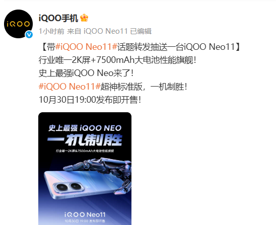 10月22日消息,iQOO手机官方微博宣布将于10月30日发布iQOO Neo11。