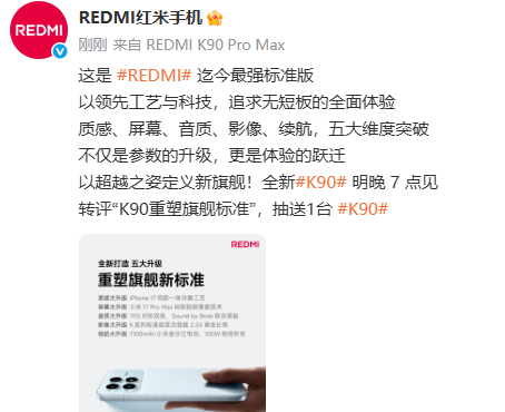 10月22日,据REDMI红米手机官方微博发布,在连续多日为REDMI K90 Pro Max预热后,REDMI红米手机终于在发布前一天正式官宣K90标椎版,与K90 Pro Max同步开始预热。