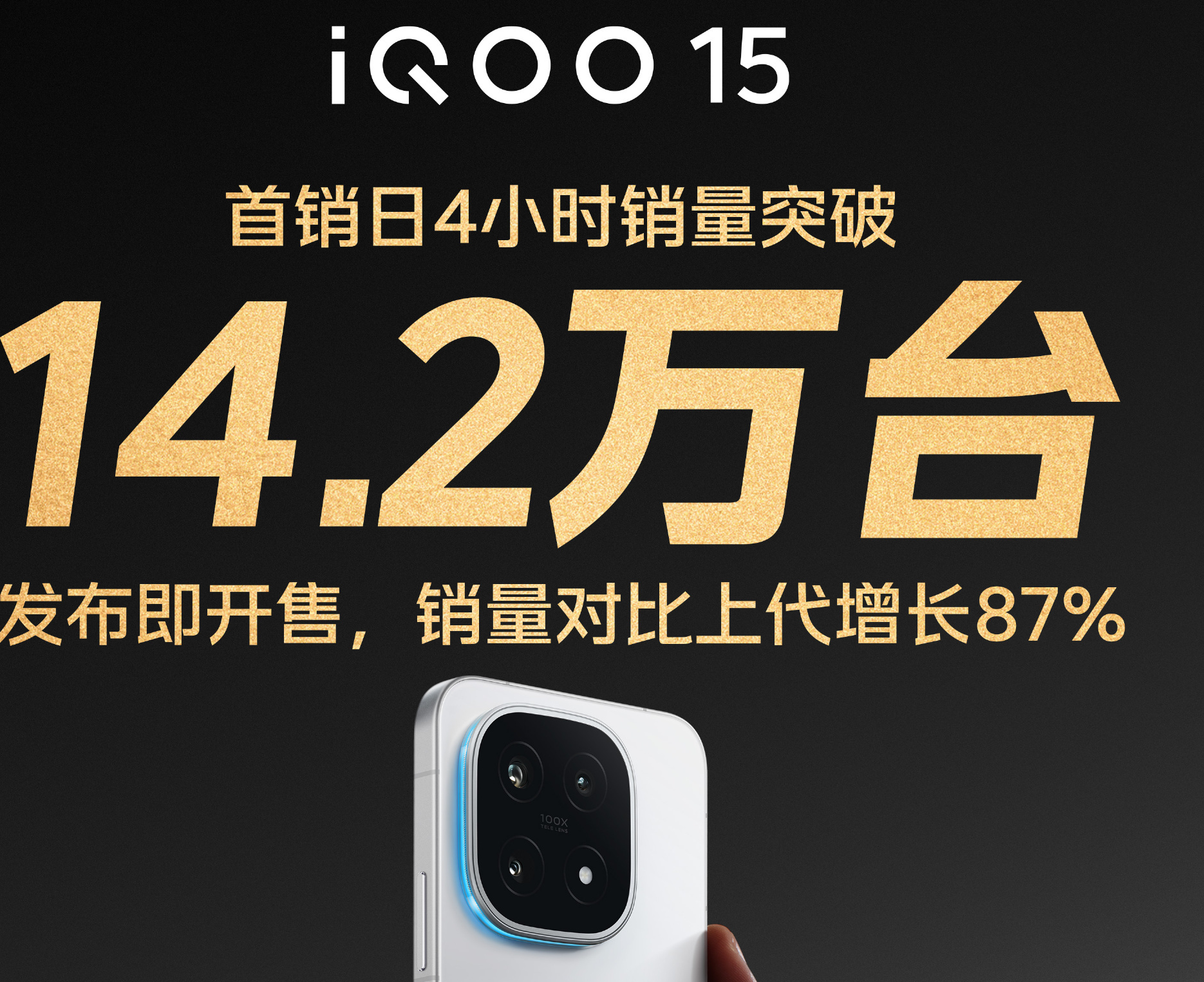 近日,据iQOO官方消息,iQOO 15首销日4小时销量突破14.2万台,同比增长87%,创iQOO历史销量新高。