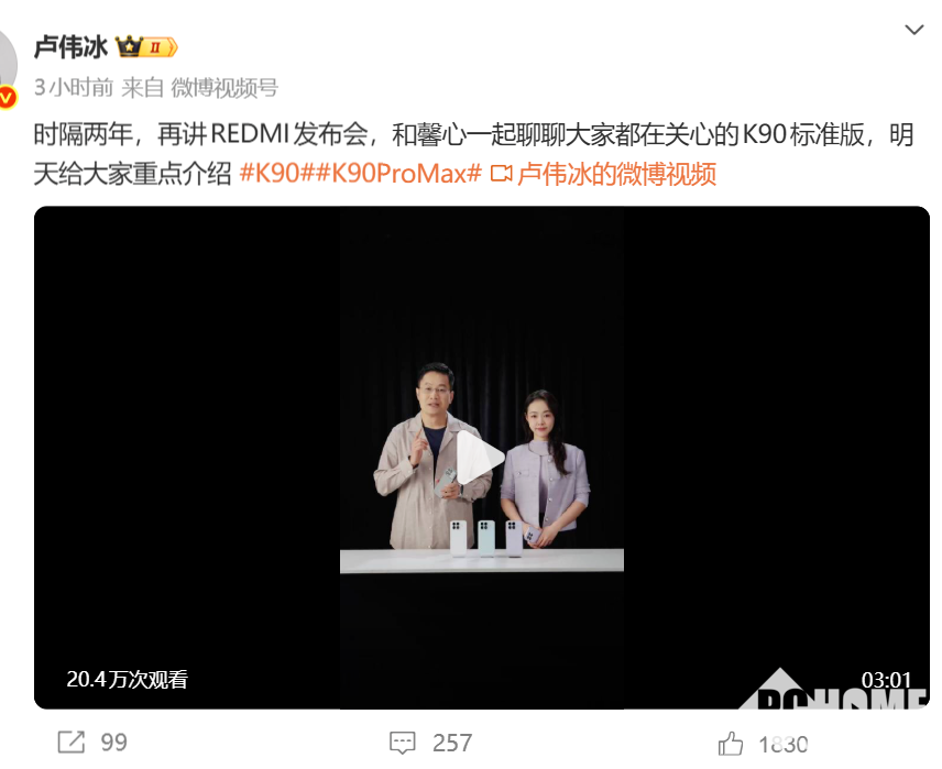 10月22日,小米集团合伙人、总裁,手机部总裁,小米品牌总经理卢伟冰在社交媒体官宣,将于10月23日亲自执掌REDMI新品发布会,这是他时隔两年再度回归REDMI主场,聚焦K90系列旗舰机型的发布,引发行业广泛关注。