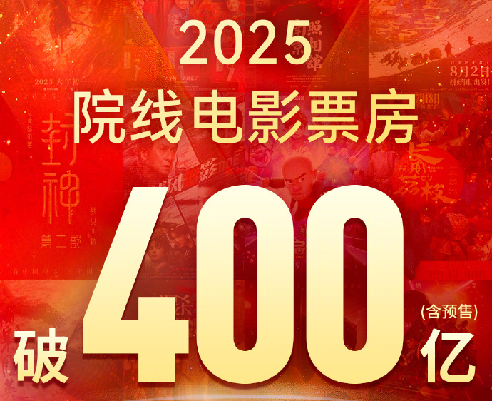 今日,据猫眼专业版最新数据显示,中国电影年度总票房(含预售)正式突破400亿元大关,较2024年提前76天达成这一里程碑。其中国产电影表现尤为突出,票房占比高达88.8%,年度票房前十名全部为国产影片。