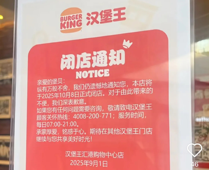 近日,有消费者在社交媒体发布信息称,深圳华强北多家汉堡王餐厅已于近期关闭。其中,位于华强北核心商圈的一家门店在9月1日正式停业,该门店曾是汉堡王进入深圳市场最早设立的四家门店之一。