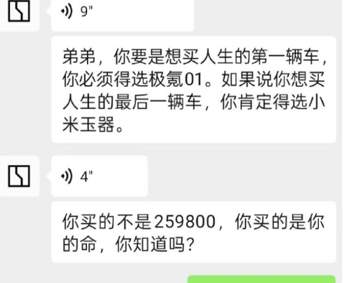 今日,有用户在社交平台发帖称,因为选择购买小米汽车,被极氪销售“诅咒”,该销售称“如果说你想买人生的最后一辆车,你肯定得选小米YU7”
