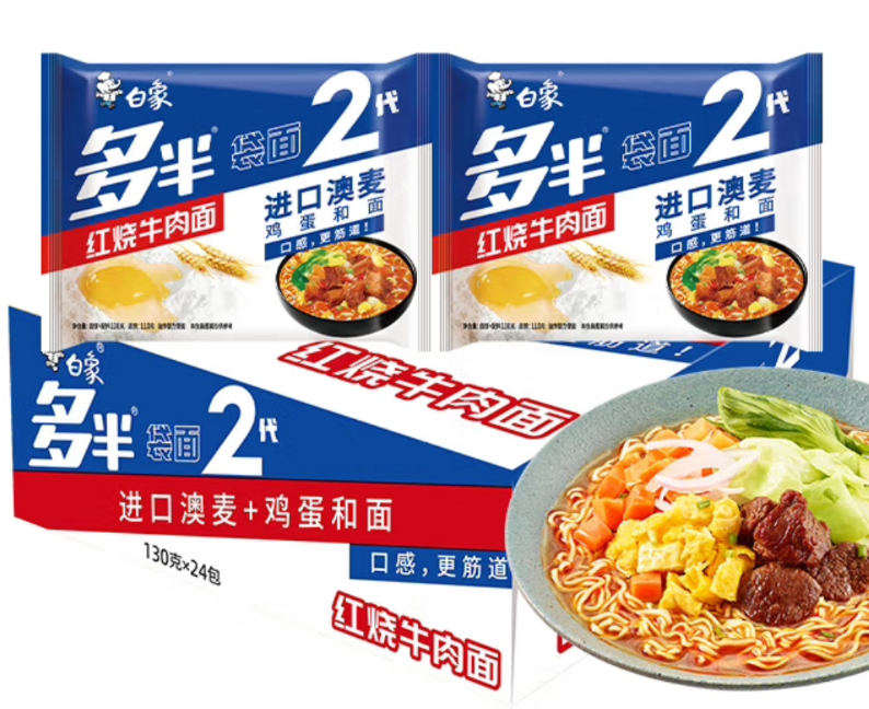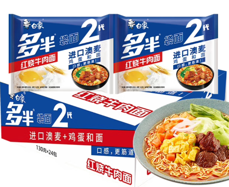声明中,白象解释“多半”产品分为两类:一类基于原70克面饼,推出110-120克面饼的大份量产品;另一类“多一半”则基于原60克面饼,推出100克面饼产品。强调商标注册初心是与常规份量产品做区分,便于消费者选购。