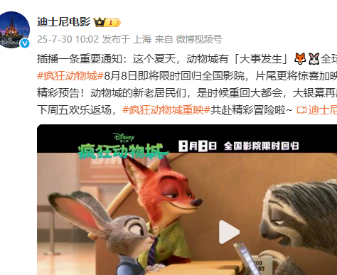 7月30日,迪士尼宣布《疯狂动物城》将于8月8日在中国内地影院限时重映。本次重映将特别加入《疯狂动物城2》的官方预告片。