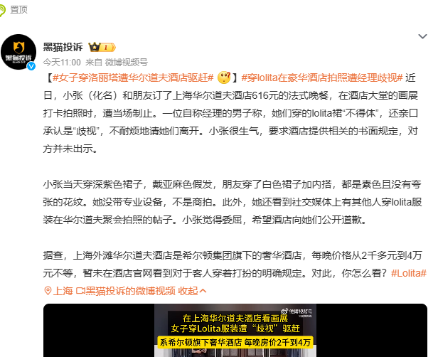 8月1日,黑猫投诉官方微博发文称,近日一女子小张(化名)与朋友在上海华尔道夫酒店大堂的画展打卡拍照时,遭一男性经理当场制止。该男子称,小张与朋友的着装不得体,不得在此拍照,并且亲口承认自己就是在歧视。