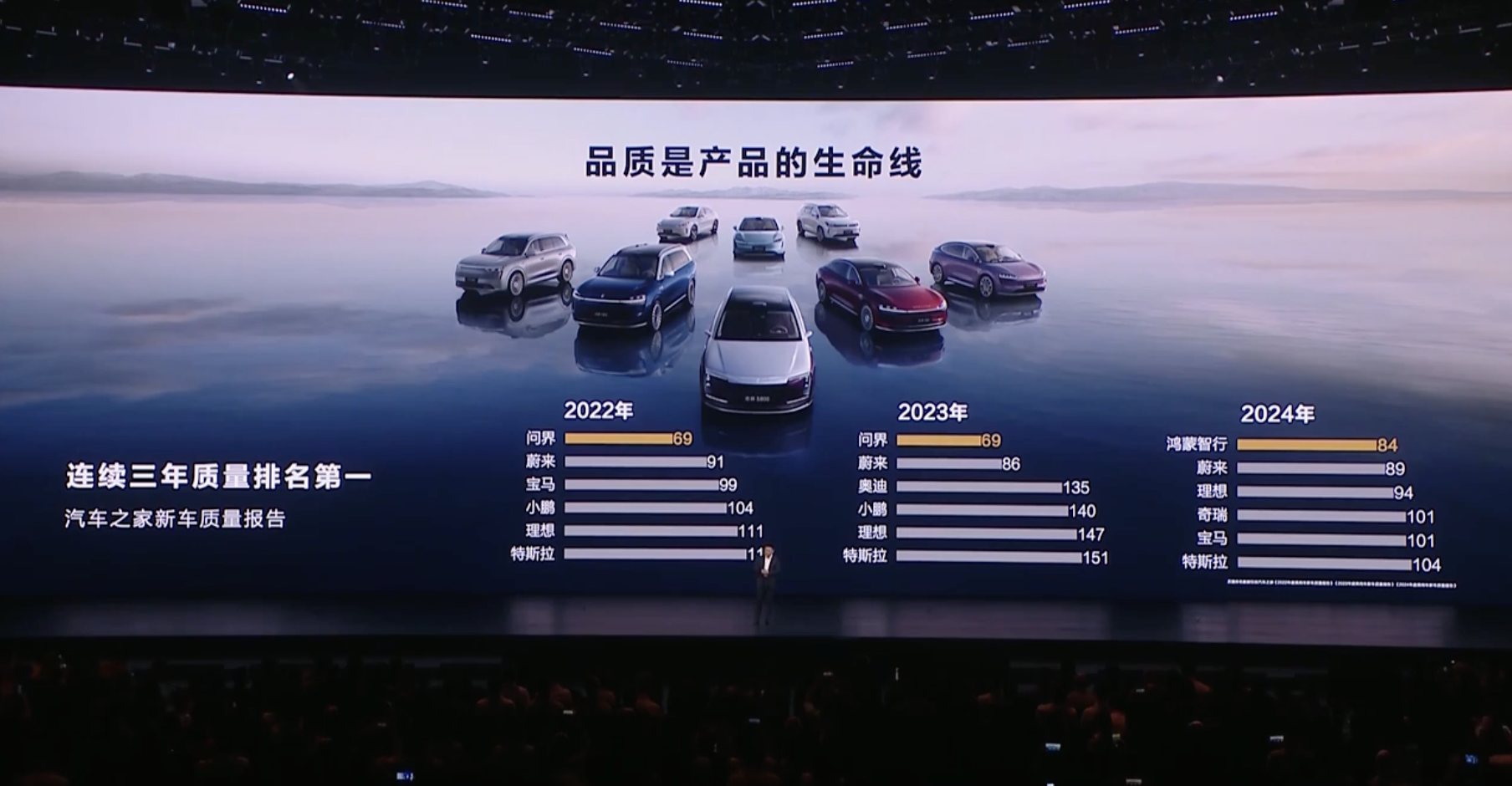 4月16日下午14:30,鸿蒙智行新品发布会举行,发布会上华为常务董事、终端BG董事长余承东称,2022年至2024年鸿蒙智行连续三年质量排名第一。