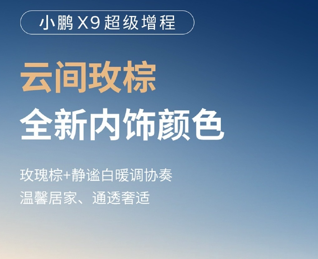 10月24日,小鹏汽车官方微博公布了小鹏X9增程版的内饰官图。新车内饰以“星舰头等舱”为设计理念,采用“云间玫棕”配色,并使用“阿尤斯真木”材质。