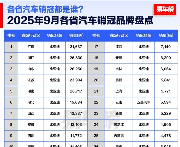 10月22日,2025年9月全国各省汽车销量数据出炉,比亚迪以绝对优势霸榜,拿下28个省份的销量冠军,尽管面临吉利、奇瑞等对手的激烈竞争,仍稳居国内市场头部地位。数据显示,比亚迪9月总销量达39.63万辆。
