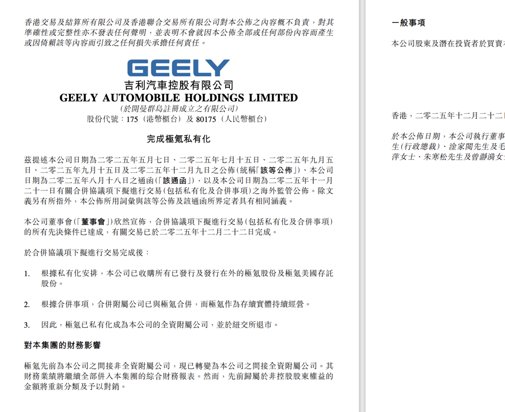 2025年12月23日消息,吉利汽车与极氪合并交易已于昨日正式完成,极氪智能科技控股有限公司已成为吉利汽车的全资附属公司,并即日起从纽约证券交易所退市。