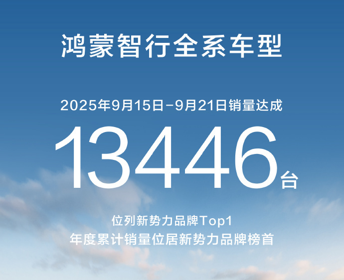9月24日,华为鸿蒙智行公布最新销售数据显示,在9月15日至21日单周内,其全系车型销量达13446台,位列新势力品牌首位。同时,该品牌在2025年累计销量继续保持新势力品牌第一。