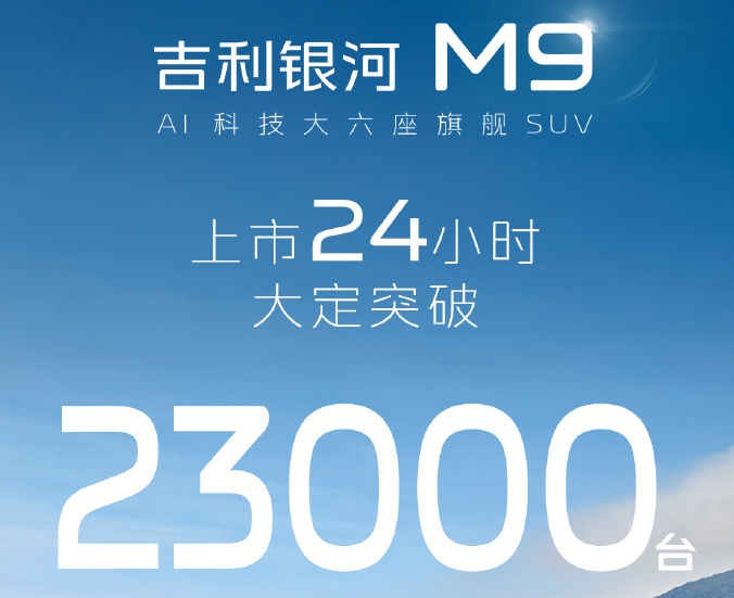 9月18日,吉利银河官方于昨晚宣布,旗下“国民旗舰”SUV银河M9在上市24小时内,大定订单数量强势突破2.3万台。