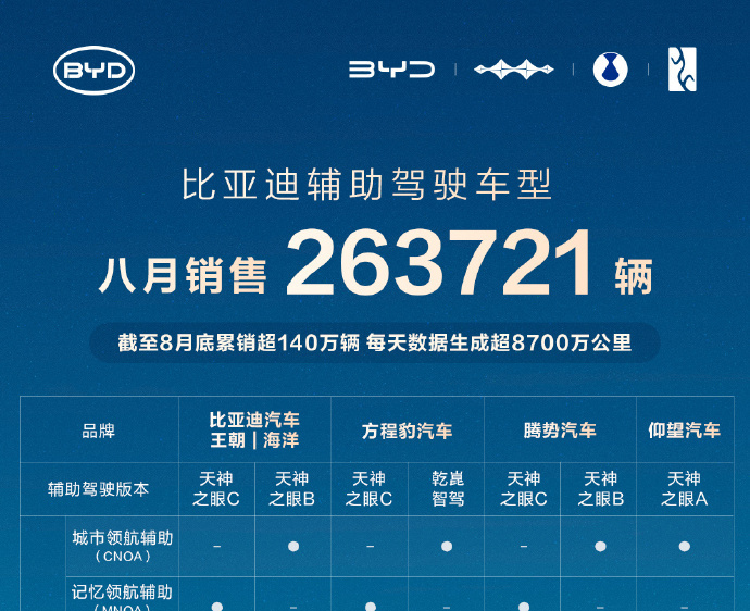 9月19日,比亚迪发布其辅助驾驶系统“天神之眼”相关车型的销售数据。截至8月底,比亚迪旗下搭载该系统的车型累计销量已突破140万辆。仅8月单月,辅助驾驶车型销量达到263721辆,占品牌国内总销量的90%。