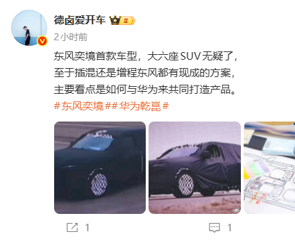 2025年11月27日,博主“德卤爱开车”发布博文,晒出了汽车伪装图,他表示:该车为东风奕境首款车型,大六座SUV无疑了。