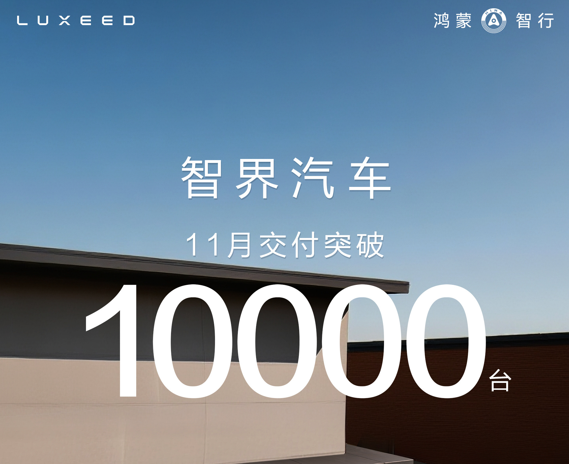 2025年11月28日,智界汽车官方宣布,11月智界汽车交付突破10000台,连续2个月交付过万,连续3个月大定破万。