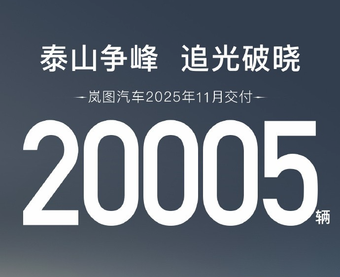 2025年12月1日,岚图汽车官方发布博文,岚图汽车2025年11月交付20005辆,1至11月累计同比增长82%,并宣布,12月10日岚图追光L压轴上市。