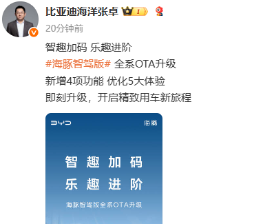 9月8日,比亚迪海洋网总经理张卓发文表示,海豚智驾版正式启动全系OTA升级,将为用户带来4项新增功能与5大体验优化,进一步提升这款明星车型的智能出行体验。此次升级覆盖超90万海豚智驾版用户,无需到店即可免费获取。