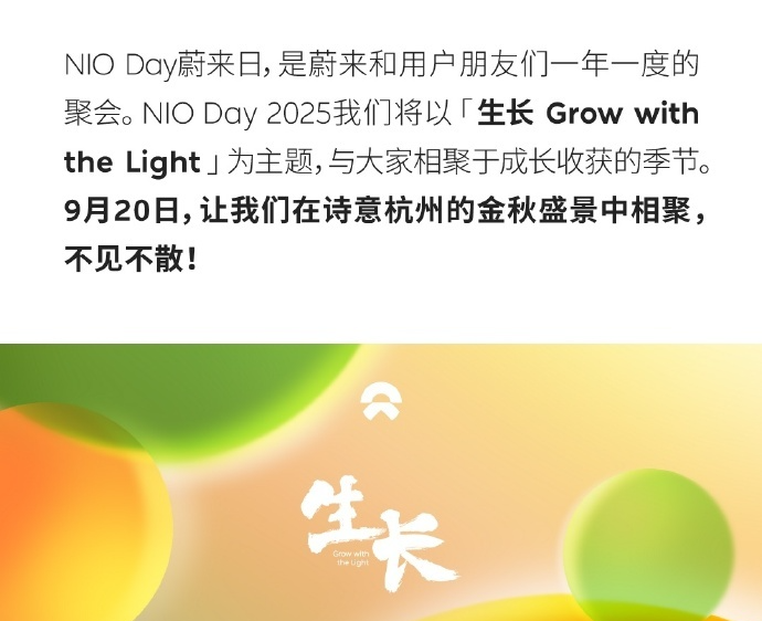 9月5日,蔚来汽车官方今天宣布:NIO Day 2025报名今天正式开启。9月20日,NIO Day 2025将在杭州大会展中心5号馆举办,主题为“生长Grow with the Light”,同时全新ES8也将正式上市。