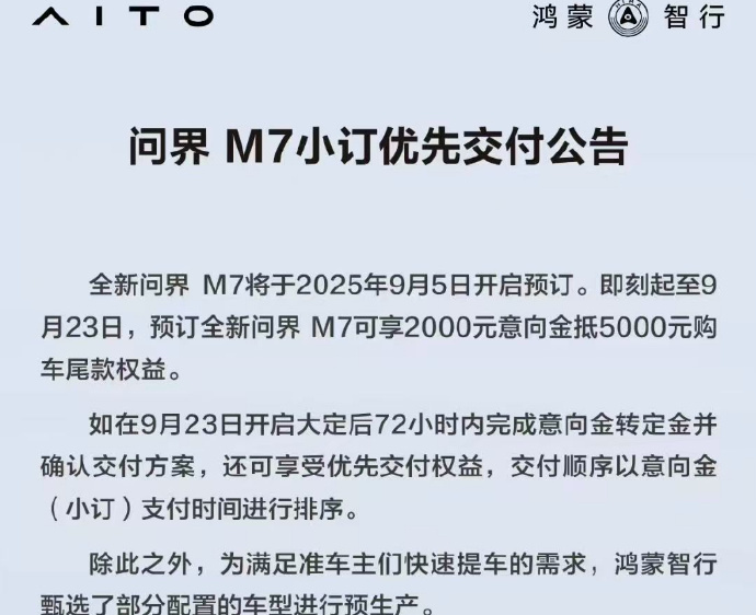 9月5日,鸿蒙智行“幸福旗舰”全新问界M7今日开启预订,预售价28.8万起。鸿蒙智行也发布全新问界M7小订优先交付公告。