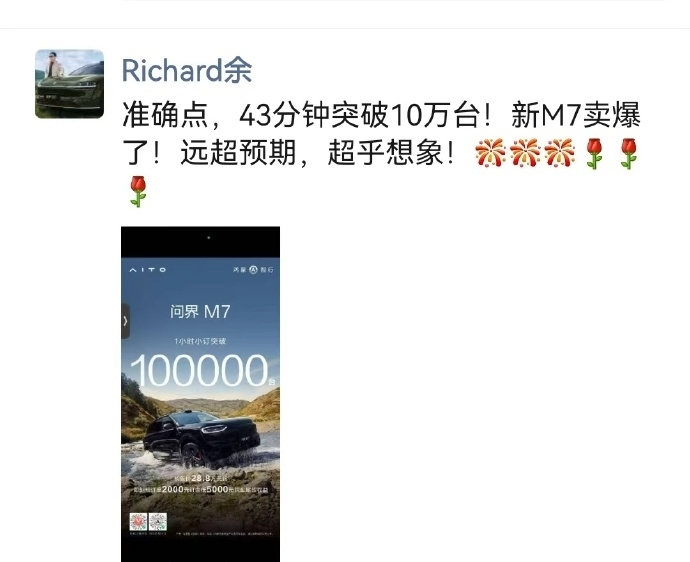 9月6日,鸿蒙智行宣布全新问界M7开启预订后24小时内,小订量突破15万台,创下品牌单日预订量新纪录。问界M7预售价28.8万元起,预订期间实现了10分钟订单破2万台、1小时突破10万台、6小时达13万台的好成绩。