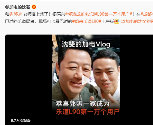 8月29日,蔚来汽车旗下乐道品牌首款车型L90达成一万台交付,演员郭涛出席2025成都车展蔚来乐道发布会现场,成为乐道L90第一万台用户。蔚来创始人、董事长兼CEO李斌也在微博转发祝贺。