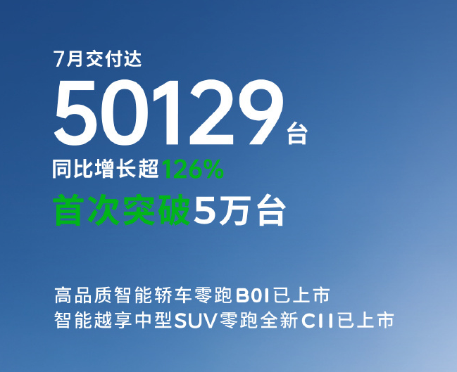 8月1日,零跑汽车官方今日发布了7月交付数据。零跑在7月交付达50129台,同比增长超126%,月销量首次突破5万台,且连续5个月稳居新势力月销领先位置。