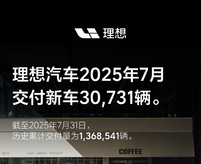 8月1日,理想汽车官方今日公布了7月交付数据。2025年7月,理想汽车交付新车3.07万辆。理想汽车去年7月交付量为5.1万辆,由此计算可得今年7月的交付情况为同比下降39.74%。
