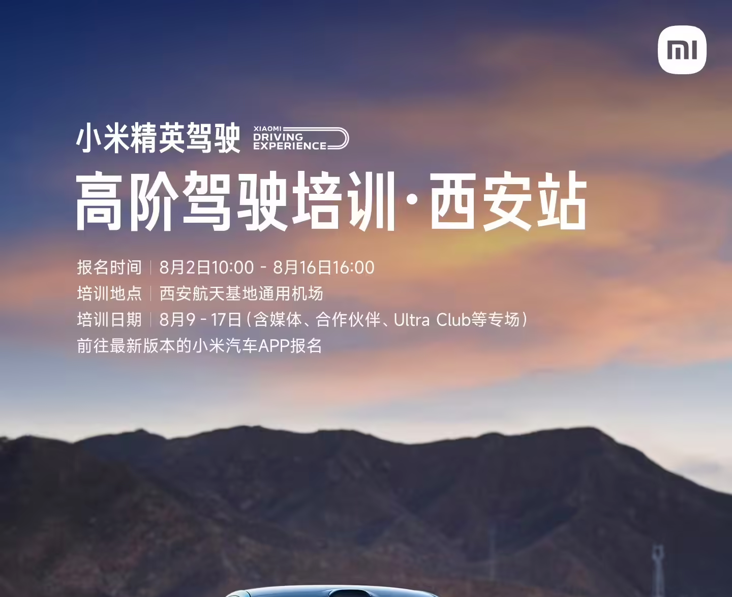 小米汽车官方宣布,“小米精英驾驶高阶驾驶培训”项目将在西安举办,报名时间为8月2日10时至8月16日16时,培训将于8月9日至17日在西安航天基地通用机场开展。
