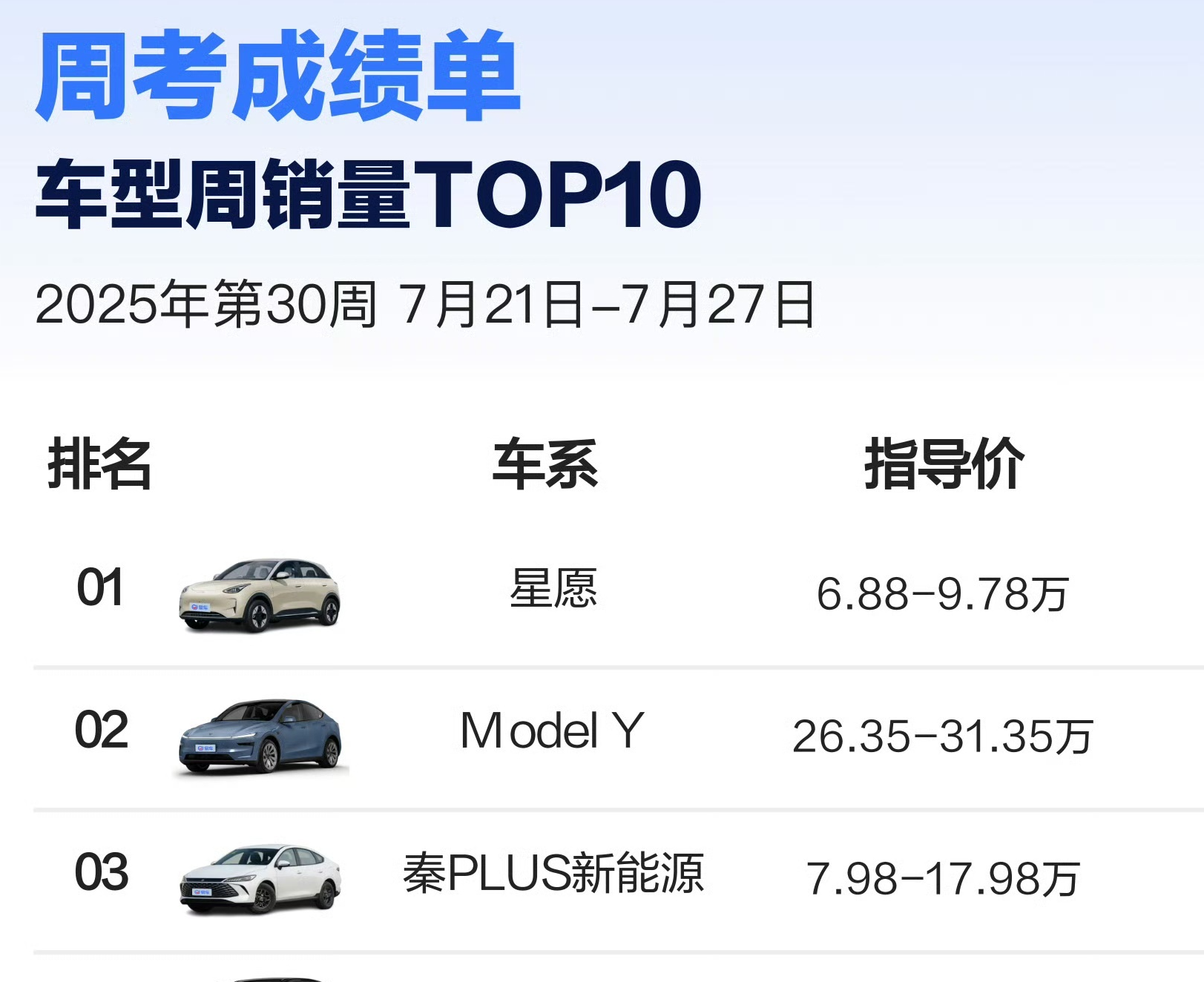 7月29日,易车今日发布了车型周销量TOP10榜单。星愿以1.09万辆的成绩登顶,6.88-9.78万的指导价,契合大众消费需求。Model Y凭借0.79万辆位列第二,小米SU7与问界M8分列第8名和第10名。