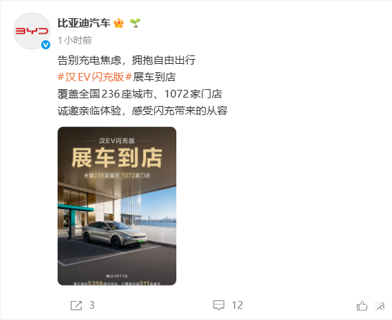PChome 4月20日消息,今日,比亚迪宣布汉EV闪充版展车已到店,覆盖全国236座城市、1072家门店。