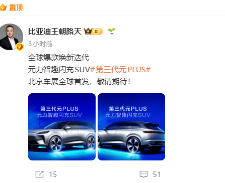 PChome 4月20日消息,今日,比亚迪王朝网销售事业部总经理路天透露,第三代元PLUS车型将于2026北京车展全球首发,定位“元力智趣闪充SUV”。