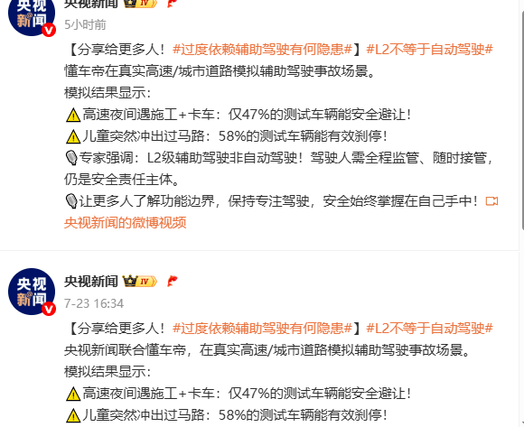 近日,懂车帝发布了对多款车型,在城市和高速路段的事故场景模拟下的辅助驾驶的表现引起了很大的争议。随后,有网友发现央视新闻已经在之前的发的微博上进行了修改,将联合懂车帝中的“联合”二字给悄然去掉。