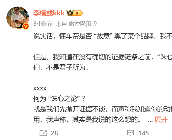 7月26日,近日魅族前高管李楠近日也在社交媒体针对懂车帝多次发文,今日他再次发文并表示,在没有确切的证据链条之前,“诛心之论”和“恶意揣测”去攻击他们,不是君子所为。