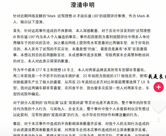 日前,理想汽车副总裁(VP)刘杰晒出一张截图,怀疑即将上市的理想i8遭遇了抹黑。该评论的当事人今日也发布澄清声明表示,对于言论中涉及试驾理想i8和乐道L90均属个人编造,并表示自己本意是想“钓鱼”。