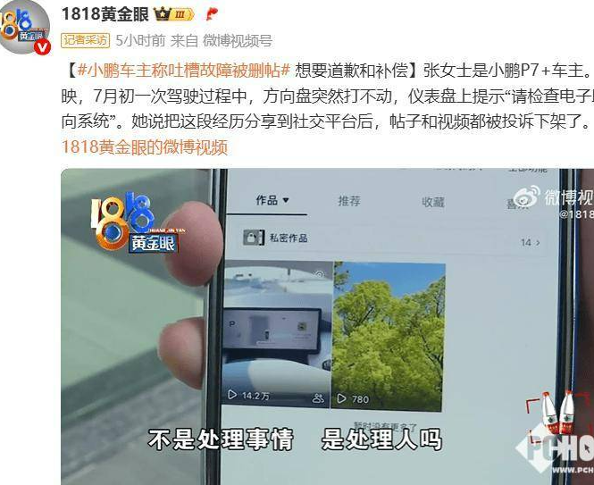 7月27日,据“1818黄金眼”昨日报道,小鹏P7+车主张女士反映,7月初一次驾驶过程中,方向盘突然打不动,她说把这段经历分享到社交平台后,帖子和视频都因侵权被投诉下架了。