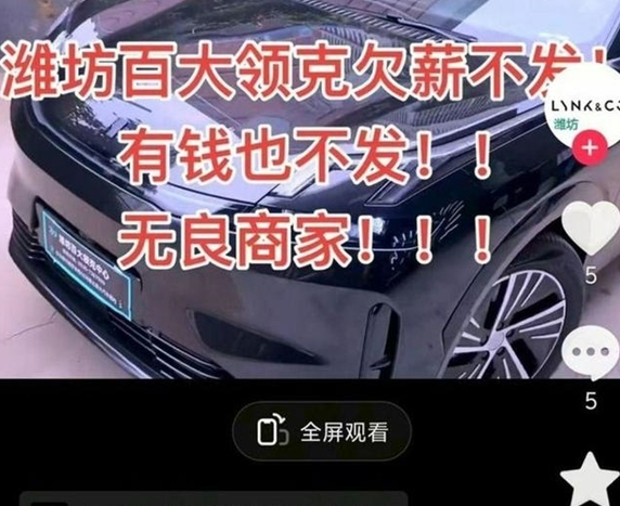 7 月 24 日,据新黄河报道,带蓝 V 认证的抖音账号“潍坊百大领克中心”发布两条视频,画面以领克汽车为背景,用醒目的红字控诉“潍坊百大领克欠薪不发,有钱也不发,无良商家”,引发网友及车主广泛关注。