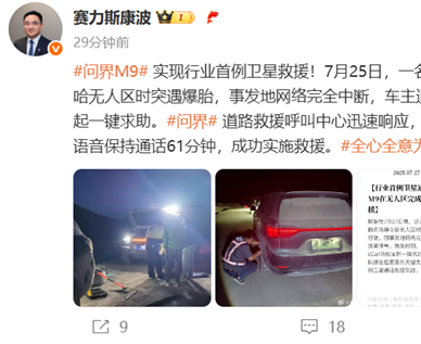 7月27日,赛力斯集团副总裁康波今日发文表示,问界M9实现行业首例卫星救援。