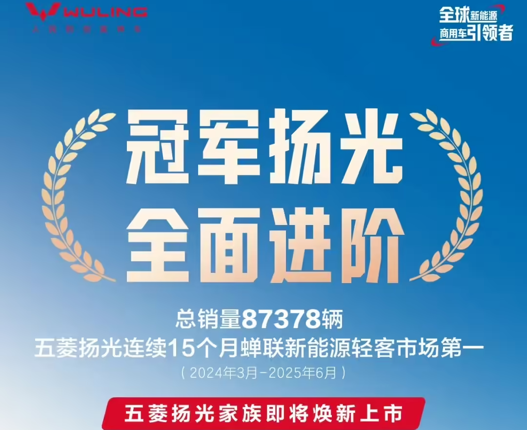 五菱红标旗下五菱扬光家族即将焕新上市。五菱扬光家族总销量已达87378辆,连续15个月蝉联新能源轻客市场销量冠军。