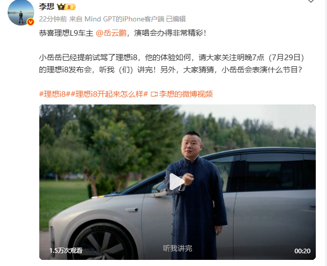 7月28日,理想汽车CEO李想今日在社交媒体平台发文,官宣理想L9车主岳云鹏将亮相明日举行的理想i8发布会,并分享他在试驾理想i8过后的体验。并让大家“谁都别走,听‘我(们)’讲完!”
