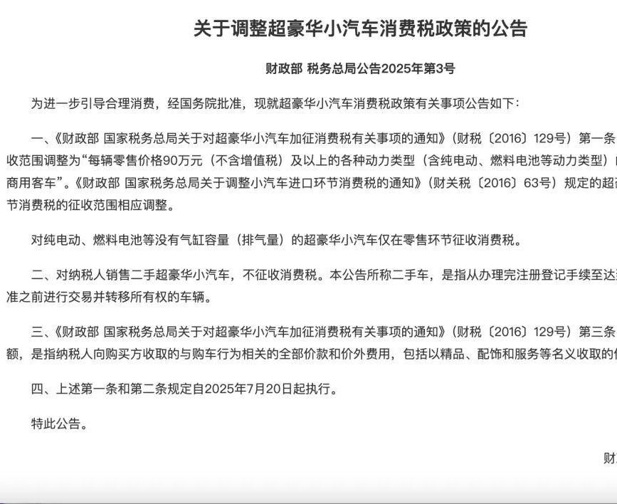 财政部与税务总局联合发布《关于调整超豪华小汽车消费税政策的公告》,标志着中国高端汽车市场进入税收规则重构的新阶段。
