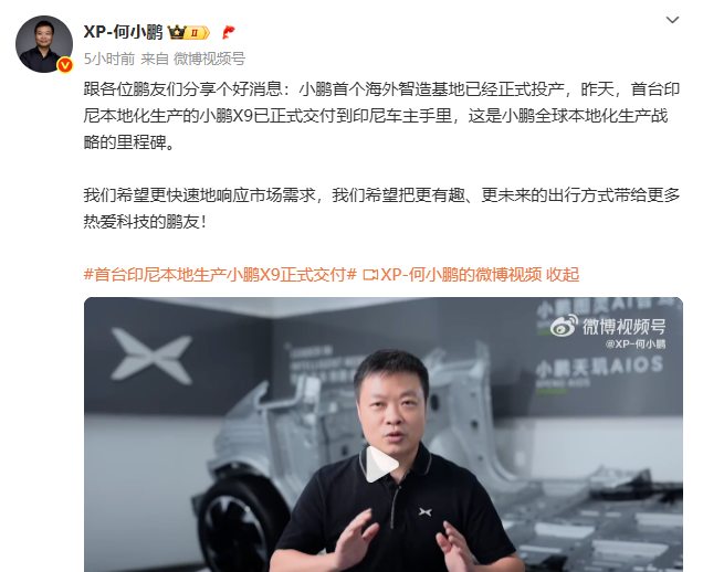 7月24日,小鹏汽车董事长何小鹏今日宣布,小鹏首个海外智造基地正式投产。据何小鹏描述,首台印尼本地化生产的小鹏X9昨日已交付至印尼车主手中。