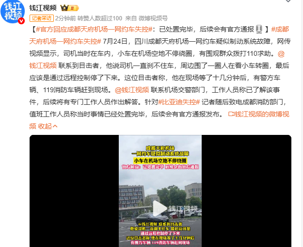 7月24日,据钱江视频报道,四川成都天府机场一网约车疑似制动系统故障,在机场的空地上一直不停的转圈。司机称刹不住车,最后通过远程控制停了下来。