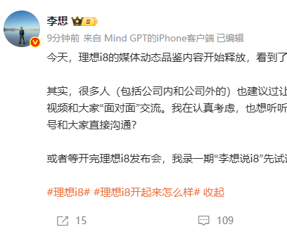 7月24日,理想汽车CEO李想发文表示,很多人让他学习雷军通过视频和大家“面对面”沟通,他本人目前也在认真考虑此事。或许在理想i8的发布会后,他会先录一期“李想说i8”试试。