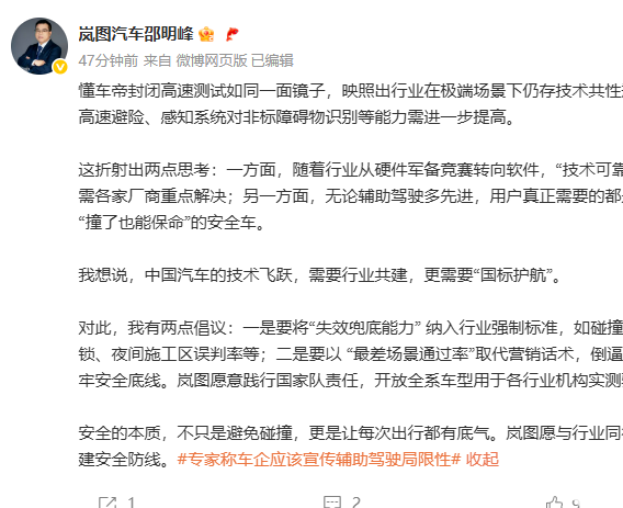 岚图汽车CBO、销售公司总经理邵明峰发文表示,懂车帝封闭高速测试如同一面镜子,映照出行业在极端场景下仍存技术共性瓶颈