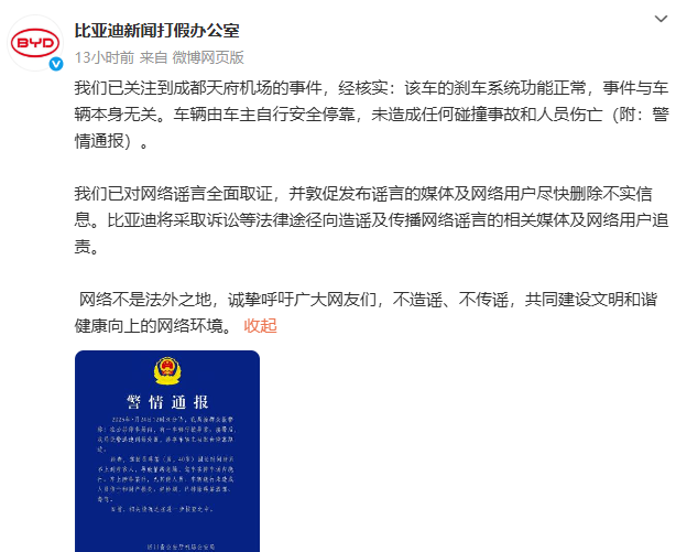 7月25日,比亚迪官方昨晚对天府机场一比亚迪汉失控事件做出辟谣表示,该车的刹车系统功能正常,事件与车辆本身无关。