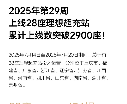 7月22日,理想汽车官方今日宣布在2025年的第29周,上线28座理想超充站,累计上线数突破2900座。